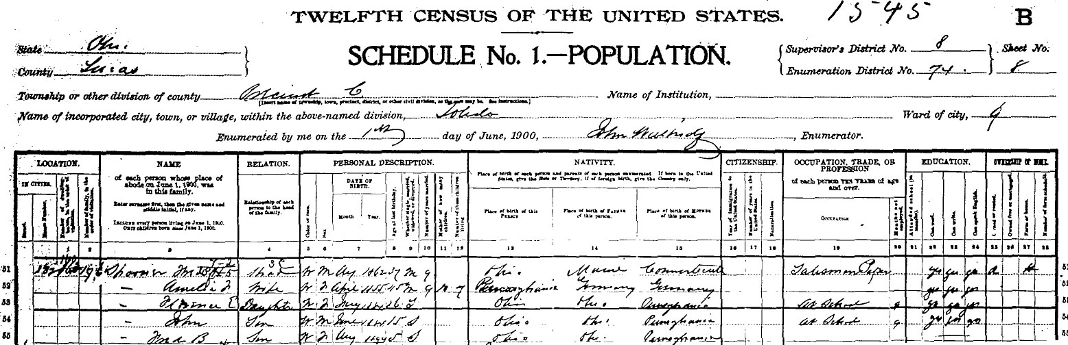 The US Census Records for 1890 were about 98 % destroyed by fire and the Schaubs and Schlagels were some of the millions of its victims. So I do not know which of Amelia Schaub's sisters were married or perhaps did not survive at this point. I do know that her daughter Amelia Sophia dies on November 8, 1888 just 11 days past her 15th birthday. Then Amelia Sophia's little brother and my Grandpa's big brother Earl dies on November 18th 1894 a month shy of turning 11. Here is what is left of the Schagel / Spooner family of 19th Street Toledo Ohio as it appeared in the 1900 Census taken June 1st.