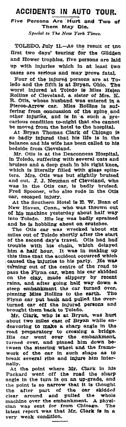 In July of 1907 Fred H. Spooner may be the Fred Spooner who was a passenger in a huge Pierce Arrow $6500.00 65 HP touring car? It was entered in the Glidden Tour, passing through Toledo. The Glidden Tour was one of America's earliest and longest running rally / races. The Fred Spooner listed, was the was the only one who walked away from the crash of the Otis car.