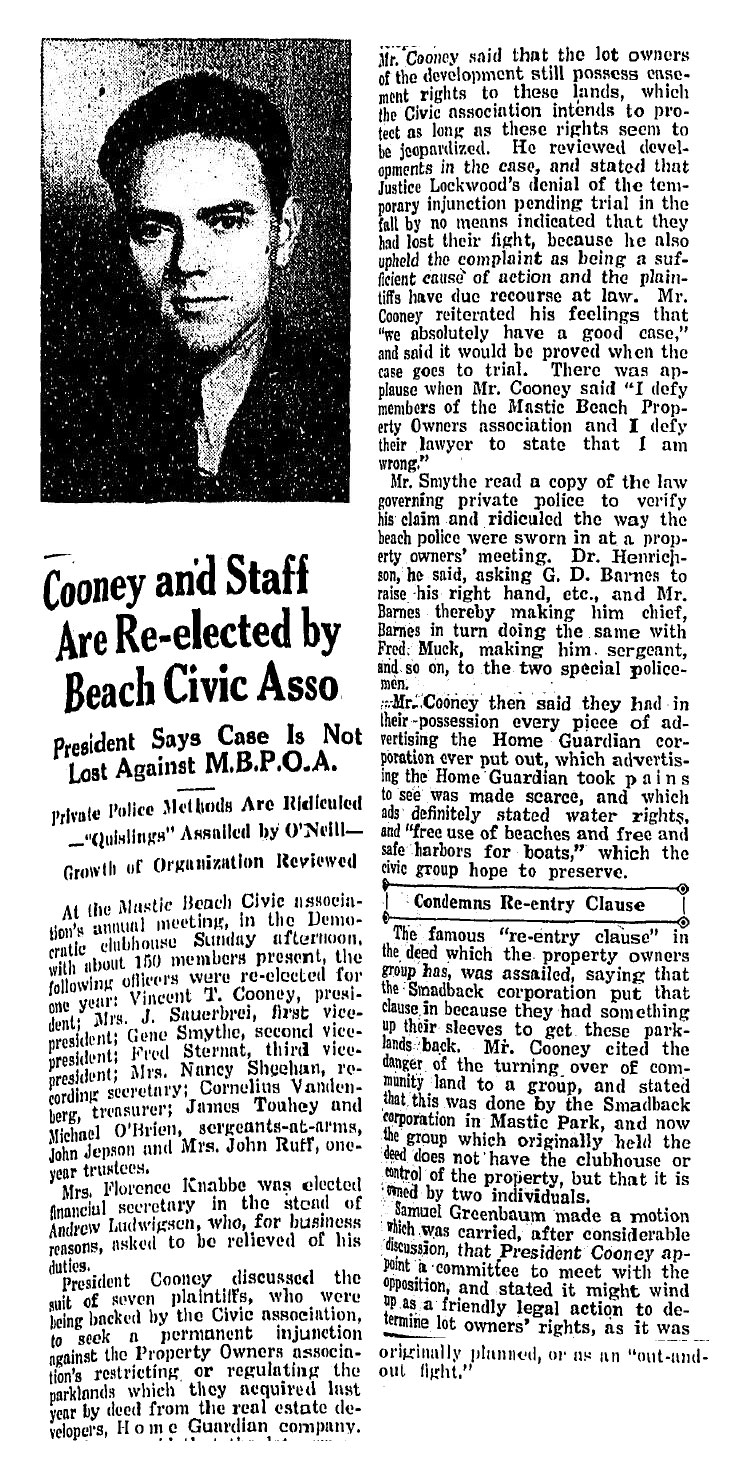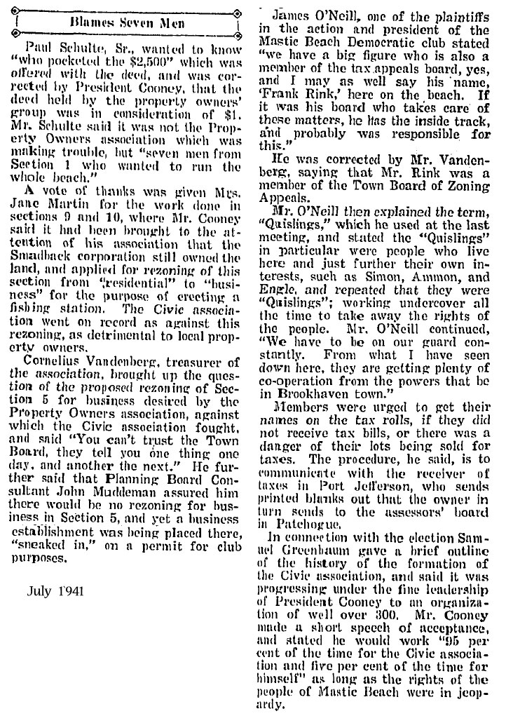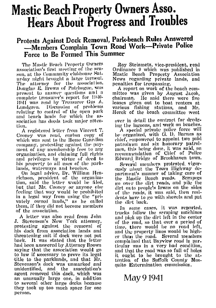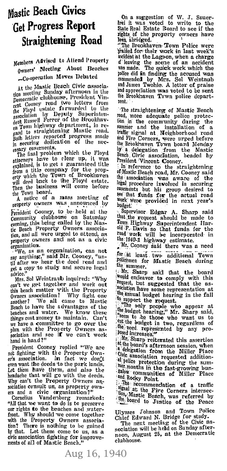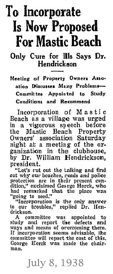 On August 31, 2010, the 84 year old town of Mastic Beach voted itself into becoming an incorporated village. The people were sharply divided on this issue, but as you can see by these artcles from 60 + years ago, that was nothing new.