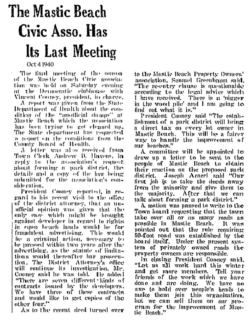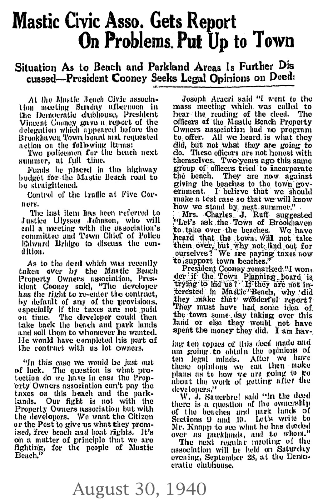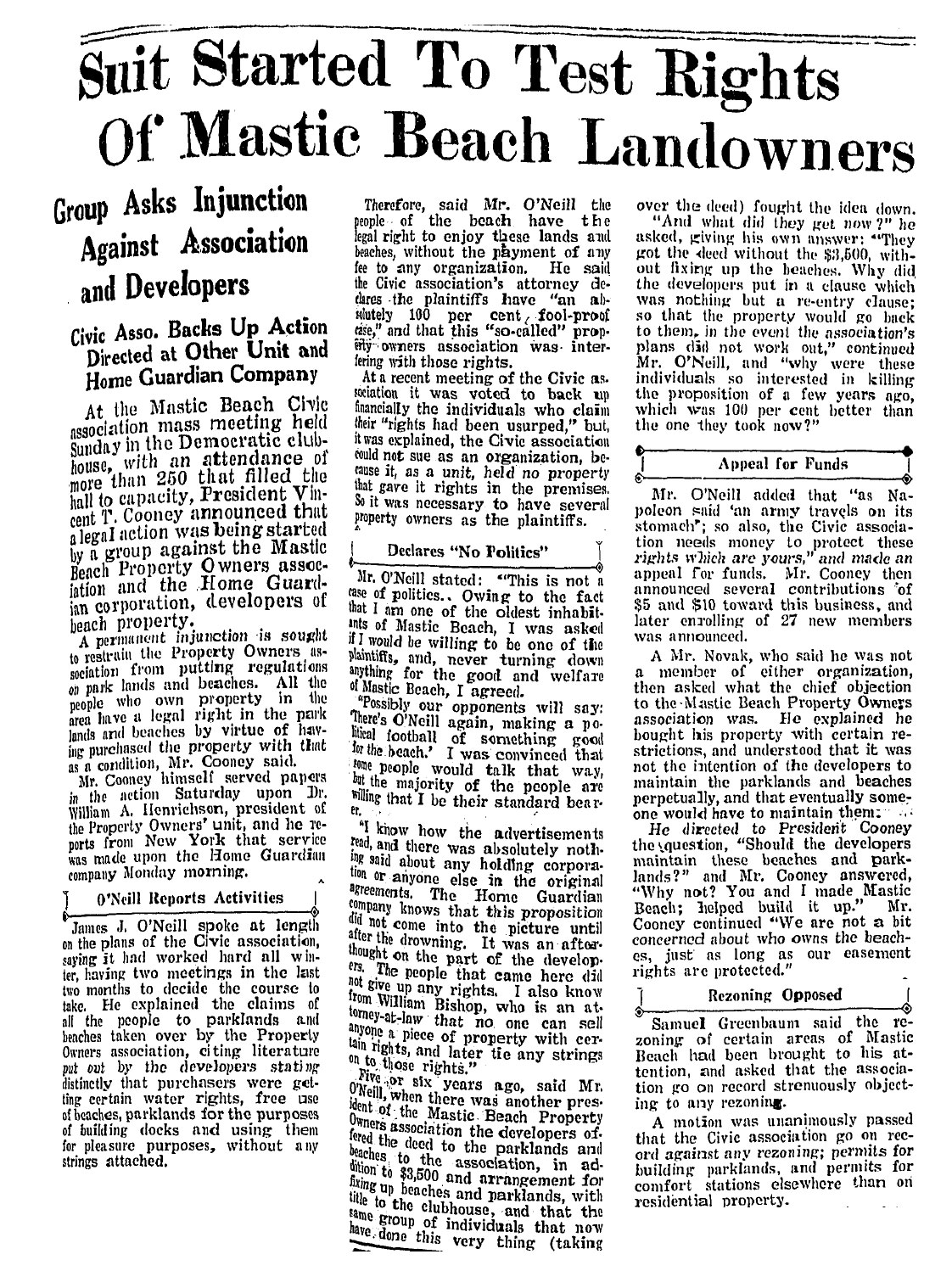 On August 31, 2010, the 84 year old town of Mastic Beach voted itself into becoming an incorporated village. The people were sharply divided on this issue, but as you can see by these artcles from 60 + years ago, that was nothing new.