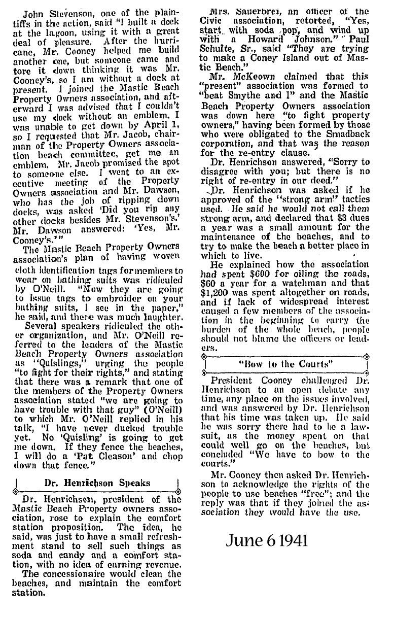Back then, the two civic groups were the MBPOA, who met in the original town of Mastic Beach clubhouse in Section 1 and the newly formed Mastic Civic Association, who met in the Democratic Clubhouse on Locust Drive in Section 3. The main dividing issue seemed to be control of the waterfront, especially that of the newly acquired waterfront and dock on the Knapp estate property. As I have said many times on this website, Knapp's estate had split the town in two for it's first 12 years of existence from 1926 - 1938 because Home Guardian had developed property on both the east and west borders of it. Within a month of the Knapp property being sold in June of '38, the president of the MBPOA, Dr. William Henrichson came out in favor of incororporation as a village as the only cure for their troubles.
