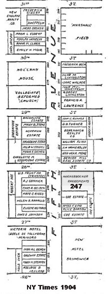 And as you can see it says 245 .....TWICE ....in case you came looking for 247 I guess.... So Knowing That All The Even Numbers Were On The West Side Of 5th Ave, my logical conclusion was the next building north of this one the one in the top photo was 247 ...(I didn't see any number on it) Actually I was not expecting to find anything that might of been what the Knapps lived in when the address for Mr. and Mrs. Joseph Palmer Knapp was 247 5th Ave, NYC from about 1906 - 1920's. But the building on the north east corner of 5th and 28th street certainly looked like it was around when the Knapps lived here. It would be another 9 months before I would come across some photos in a book that caused me to rethink what I thought back then. That book is "FIFTH AVE 1911 FROM START TO FINISH....in Historic Block by Block photographs" . Its one of the great Dover Publication photo books that I have learned a whole lot from these last four years.