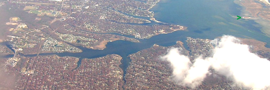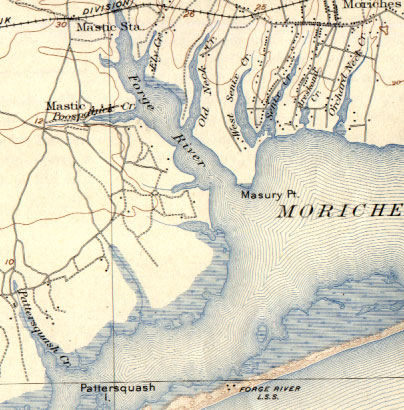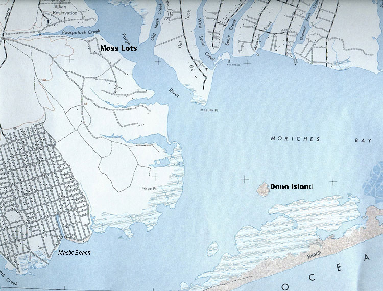 This page has been brewing on my back burner for sometime. It had taken on a second wind and a focus with my accidental discovery of "Dana Island" this past summer. Then I had held up on it, because there was another discovery of some new material about the Dana family that has yet to materialise. I can only hope it still does. Perhaps if I'm a good boy, Santa may bring it yet. A few weeks ago I asked another historian from a nearby Mastic town if he knew anything about Dana's island. His reply "Why are you so focused on Dana? Most folks around here never heard of him and even fewer remember him". I replied " I'm not focused on anything but the truth and the truth is the name Dana is a big part of Mastic history. I also said that perhaps because W. S. Dana has been gone for 66 years this New Years 2005, most folks only know about Dana Ave. in Mastic, like they do Knapp Road in Mastic Beach. But if you asked any of the 24 Mastic and Moriches old time family members like Ross or Penney that put food on their table because of the Dana's you might get a different answer. Or those lucky folks who were remembered in his will or given property in the 1950's and '60's from his widow Ella in what is now known as the quite exclusive "Old Mastic." The photo above on this page was taken in August of 2004 from aboard Marty Van Lith's "Manatee". You are in the middle of Forge River and the property you are looking at was once known as "Moss Lots" or the Dana Estate. Now lets take a look at some of the other things William S. Dana left behind beside his good name. |