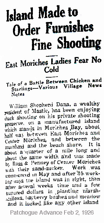 The Ross & Penney referred to in the 1926 article, are most like Clarence Ross & Clarence Penney. Both men were actively involved with maintenance and contracting on all the area estates. Clarence Ross worked at both the Floyd & Dana places and was in W. S. Dana's will. Clarence Penney's father Merritt was the superintendant of the Dana Estate in the 19th and early 20th century for William B. Dana. Clarence Penney also worked for Tangier Smiths and the Knapps. They were busy guys changing the face of the area by building docks, golf courses, roads, and dredging. A sand sucker is a type of dredge. It took 35 Days to build up enough sand to make the island that is still there. |