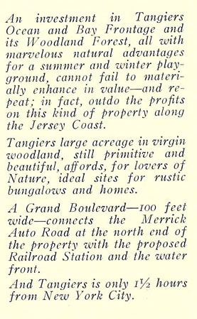 In 1913 "a syndicate" with a US Senator, William Hughes from NJ, as trustee was involved in Tangier's restructuring, That unamed syndicate wound up in a big 100,000.00 lawsuit from one angry investor but no names are mentioned in this new found Tangier Association brochure. The only hint of a perhaps a major investor is the fact that there is a Howard Blvd as the main thorough fare on Fire Island. Their NY City address is also different than that of the original Tangier Company in the Cameron Bldg on Madison Ave.