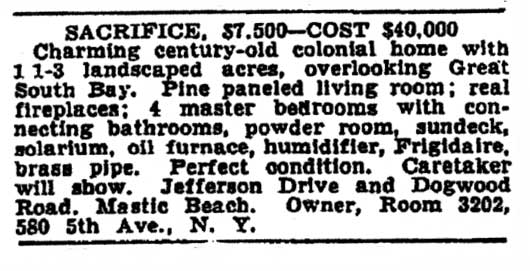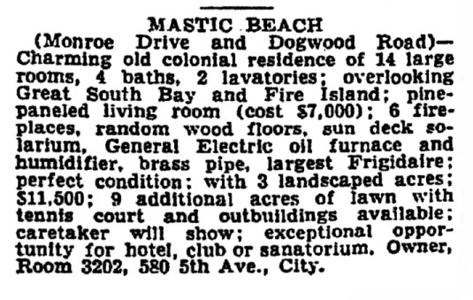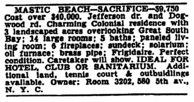 For about a year and a half from the Spring of 1939 to the fall of 1940, a group of ads appeared in the classified section of the New York Times. They are as enlightening, as they are confusing because for as many questions as they answer, they also pose new ones. In one way they reveal, who the true owner of the Knapp Mansion in Mastic Beach was, or do they? I have said from the outset, it was most likely Joseph Palmer Knapp's money that paid for the purchase of the Lawrence Estate in 1916 and the construction of this house, (he seems to know what each feature cost) even though it was titled to his children first Dodi, then to Claire, then back to Dodi on the deed.