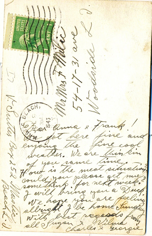 I just came across this real photo postcard from 1943 , of the era that the George Sutter family owned the Knapp Mansion. It is VERY RARE and the first one I have ever seen. Most likely George Sutter had these made to promote his now two year old venture of operating a summer boarding house. Something I believe the Sutters found no easy task during WW2. The message on the back was written by Suzan(?) of Suzan & Charlie, who were either related to or friends with Vilma & George Sutter. There is a reference to war rationing in regard to the "meat situation" . The mansion appears to be in excellent conditiion here. I'm still betting that the Sutters had professional photos taken of the interior to promote their buisness, or that there are still great interior photos that St. Judes Church of Mastic Beach had taken after they purchased it from The Sutters in 1950 .