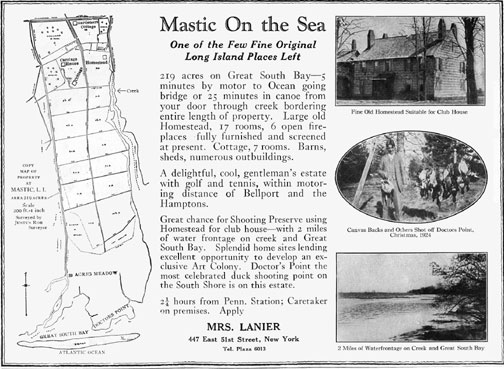 Now what we have here is a real estate ad from May of 1925. Just 13 months before The Smadbeck's would file the first Map Of Mastic Beach and change the name of the area forever. Notice the marketeers are calling it "MASTIC ON THE SEA" perhaps they were encouraged by the failed development just next door called Woodlands By The Bay.